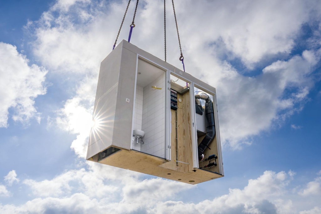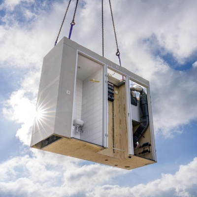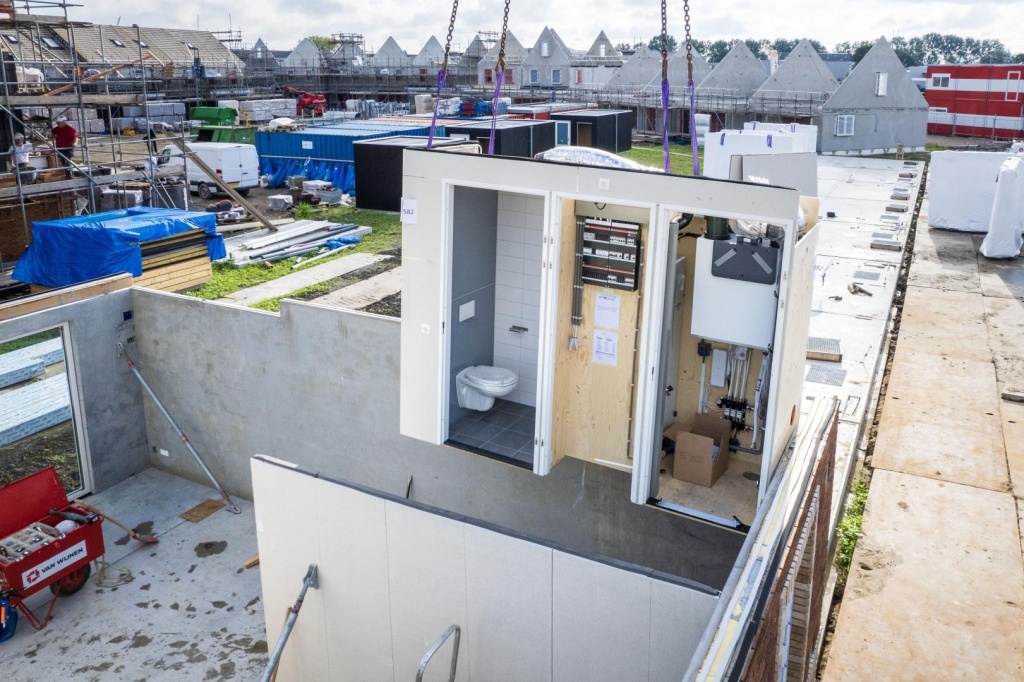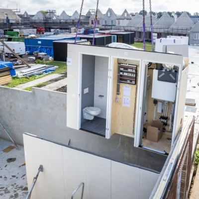 Sinds 2022 maken we bouwmodules: badkamers, toiletruimtes of technische installaties, bijvoorbeeld. Deze bouwen we helemaal in onze fabriek. Op de bouwplaats kunnen ze dan direct geplaatst en aangesloten worden. Dat scheelt tijd en maakt bouwen overzichtelijker.